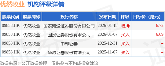 投行对该股的评级以买入为主,近90天内共有3家投行给出买入评级,近90天的目标均价为6.7港元。国泰海通证券股份有限公司最新一份研报给予优然牧业增持评级,目标价6.72港元。
