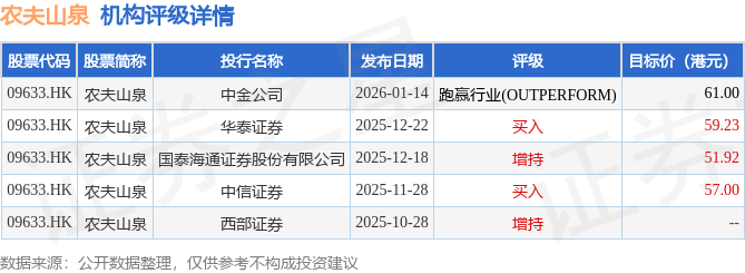 投行对该股的评级以增持为主,近90天内共有2家投行给出增持评级,近90天的目标均价为57.29港元。中金公司最新一份研报给予农夫山泉跑赢行业(OUTPERFORM)评级,目标价61港元。