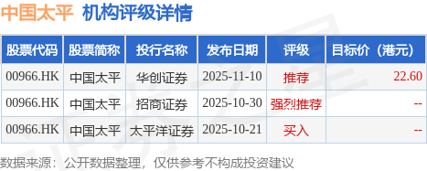 投行对该股的评级以推荐为主,近90天内共有1家投行给出推荐评级,近90天的目标均价为22.6港元。华创证券最新一份研报给予中国太平推荐评级,目标价22.6港元。