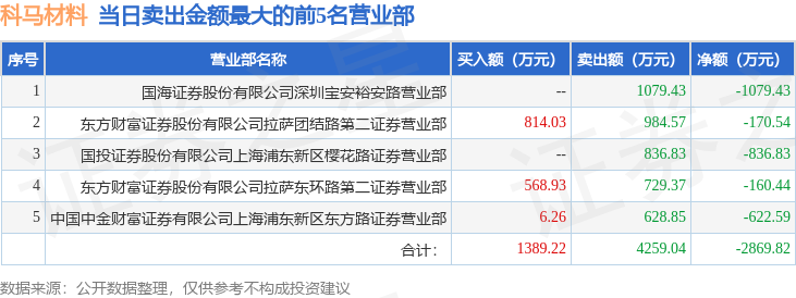 证券之星消息,沪深交易所2026年1月19日公布的交易公开信息显示,科马材料(920086)因当日换手率达到20%的前5只股票,当日收盘价跌幅达到-20%的前5只股票登上龙虎榜。此次是近5个交易日内第1次上榜。