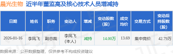 证券之星消息,根据1月19日市场公开信息、上市公司公告及交易所披露数据整理,晨光生物(300138)最新董监高及相关人员股份变动情况:2026年1月16日公司副总裁李凤飞共减持公司股份14.0万股,占公司总股本为0.029%。变动期间公司股价上涨1.04%,1月16日当日收盘报13.62元。