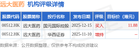 截至2026年1月19日收盘,远大医药(00512.HK)报收于7.69港元,下跌1.54%,成交量523.68万股,成交额4027.93万港元。投行对该股的评级以增持为主,近90天内共有1家投行给出增持评级,近90天的目标均价为11.88港元。国元国际控股最新一份研报给予远大医药买入评级,目标价11.88港元。