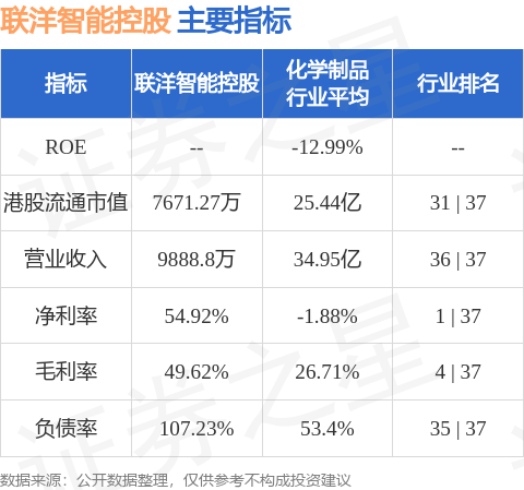 联洋智能控股港股市值7671.27万港元,在化学制品行业中排名第31。主要指标见下表: