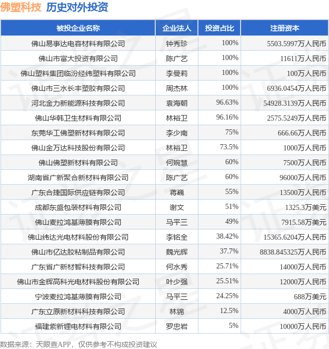证券之星消息,根据天眼查APP显示,佛塑科技(000973.SZ)新增一起对外投资事件,被投资公司为河北金力新能源科技有限公司,法定代表人袁海朝,投资占比为96.63%。该公司从事化学原料和化学制品制造业,注册资本为54928.3139万人民币。目前,佛塑科技共存在对外投资23项,投资占比前20的项目见下表: