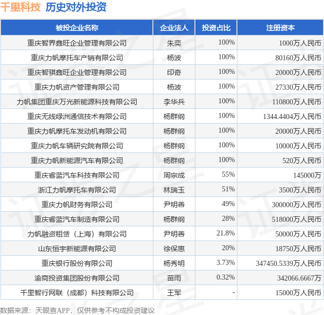 证券之星消息,根据天眼查APP显示,千里科技(601777.SH)新增一起对外投资事件,被投资公司为重庆智界鑫旺企业管理有限公司,法定代表人朱奕,投资占比为100%。该公司从事商务服务业,注册资本为1000万人民币。目前,千里科技共存在对外投资18项,详见下表: