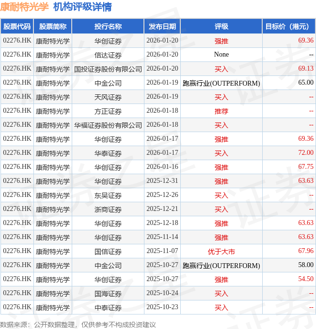 投行对该股的评级以买入为主,近90天内共有8家投行给出买入评级,近90天的目标均价为65.33港元。华创证券最新一份研报给予康耐特光学强推评级,目标价69.36港元。