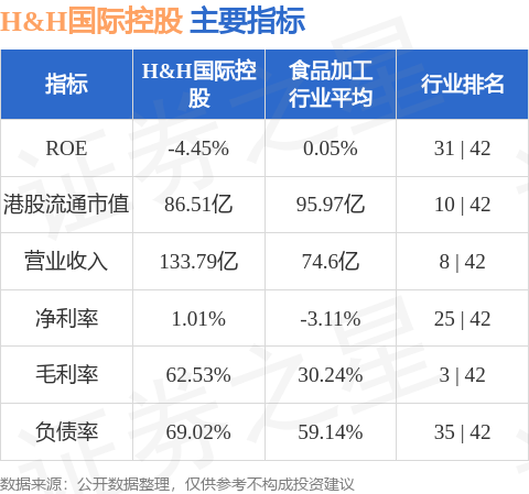 H&H国际控股港股市值86.51亿港元,在食品加工行业中排名第10。主要指标见下表: