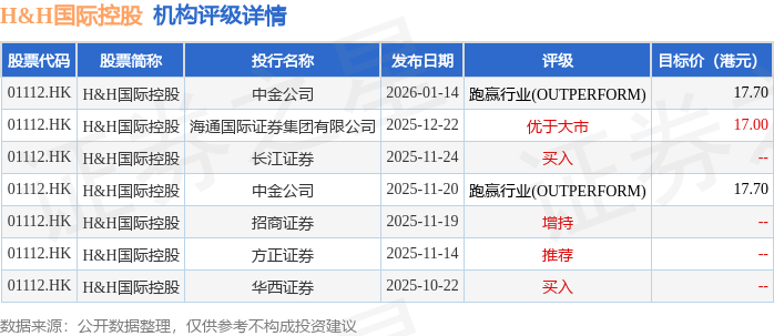 投行对该股的评级以跑赢行业(OUTPERFORM)为主,近90天内共有2家投行给出跑赢行业(OUTPERFORM)评级,近90天的目标均价为17.47港元。中金公司最新一份研报给予H&H国际控股跑赢行业(OUTPERFORM)评级,目标价17.7港元。