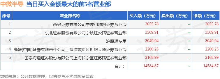 证券之星消息,沪深交易所2026年1月20日公布的交易公开信息显示,中微半导(688380)因有价格涨跌幅限制的日收盘价格涨幅达到15%的前五只证券登上龙虎榜。此次是近5个交易日内第1次上榜。