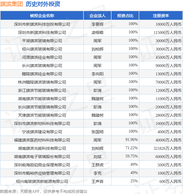 证券之星消息,根据天眼查APP显示,旗滨集团(601636.SH)新增一起对外投资事件,被投资公司为深圳市新旗滨科技创投有限公司,法定代表人李要辉,投资占比为100%。该公司从事科技推广和应用服务业,注册资本为10000万人民币。目前,旗滨集团共存在对外投资23项,投资占比前20的项目见下表: