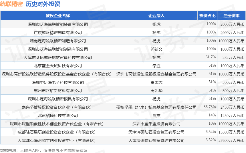 证券之星消息,根据天眼查APP显示,统联精密(688210.SH)新增一起对外投资事件,被投资公司为深圳市泛海统联智能装备有限公司,法定代表人杨虎,投资占比为100%。该公司从事专用设备制造业,注册资本为2000万人民币。目前,统联精密共存在对外投资15项,详见下表:
