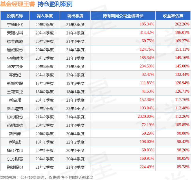 王睿管理的中信保诚新兴产业混合A基金在20年2季度买入宁德时代,在持有1年又1个季度后在21年3季度卖出。持有期间的估算收益率为262.26%,持有期间宁德时代在2020年到2021年的年报归属净利润增幅达185.34%。