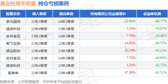 李晓星管理的银华丰享一年持有期混合基金在22年1季度买入紫光国微,在持有2年又1个季度后在24年2季度卖出。持有期间的估算收益率为-60.77%,持有期间紫光国微在2022年到2024年的年报营业总收入降幅为22.6%。