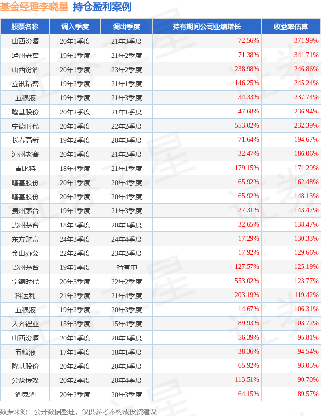 李晓星管理的银华明择基金在20年1季度买入山西汾酒,在持有2个季度后在20年3季度卖出。持有期间的估算收益率为95.81%,持有期间山西汾酒在2019年到2020年的年报归属净利润增幅达56.39%。