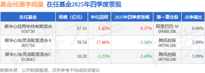 证券之星消息,截止2025年四季度末,基金经理李晓星旗下共管理3只基金,本季度表现最佳的为银华心佳两年持有期混合(010730),季度净值涨0.37%。