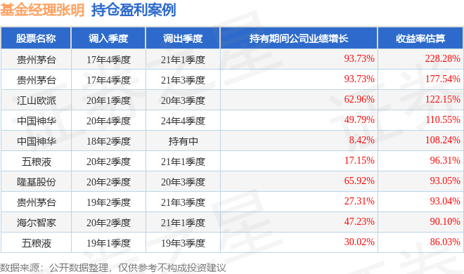 张明管理的安信中国制造混合A基金在17年4季度买入贵州茅台,在持有3年又1个季度后在21年1季度卖出。持有期间的估算收益率为228.28%,持有期间贵州茅台在2017年到2021年的年报归属净利润增幅达93.73%。