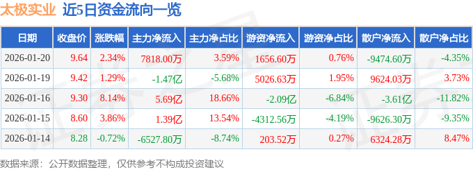 证券之星消息,截至2026年1月20日收盘,太极实业(600667)报收于9.64元,上涨2.34%,换手率10.9%,成交量228.06万手,成交额21.76亿元。
