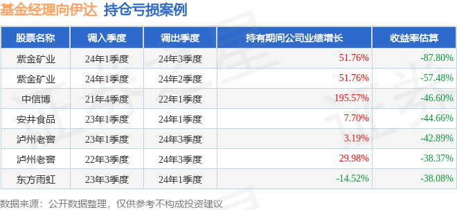 向伊达管理的银华动力领航混合A基金在24年1季度买入紫金矿业,在持有2个季度后在24年3季度卖出。持有期间的估算收益率为-87.8%,持有期间紫金矿业在2023年到2024年的年报归属净利润增幅达51.76%。