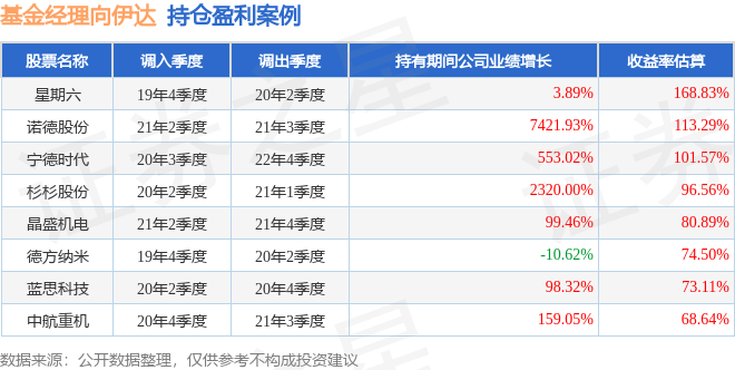 向伊达管理的银华盛利混合发起式A基金在20年2季度买入杉杉股份,在持有3个季度后在21年1季度卖出。持有期间的估算收益率为96.56%,持有期间杉杉股份在2020年到2021年的年报归属净利润增幅达2320%。