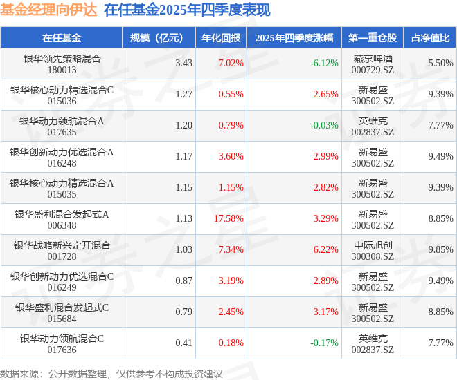 证券之星消息,截止2025年四季度末,基金经理向伊达旗下共管理10只基金,本季度表现最佳的为银华战略新兴定开混合(001728),季度净值涨6.22%。