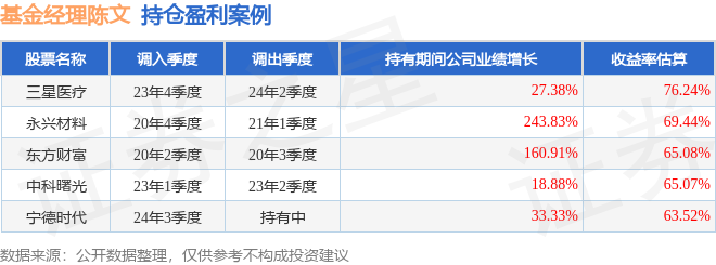 陈文管理的淳厚信睿混合A基金在23年4季度买入三星医疗,在持有2个季度后在24年2季度卖出。持有期间的估算收益率为76.24%,持有期间三星医疗在2023年到2024年的年报营业总收入增幅达27.38%。