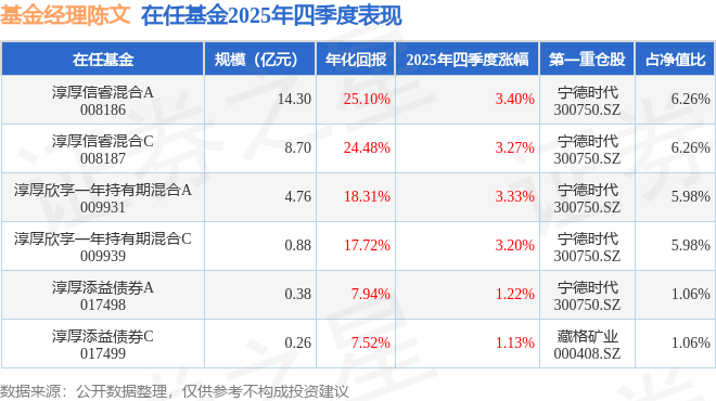 陈文管理的淳厚欣享一年持有期混合A基金在20年4季度买入永兴材料,在持有1个季度后在21年1季度卖出。持有期间的估算收益率为69.44%,持有期间永兴材料在2020年到2021年的年报归属净利润增幅达243.83%。