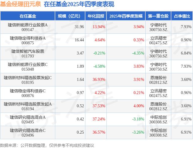 田元泉管理的建信新能源行业股票A基金在20年3季度买入宁德时代,已连续持有5年又1个季度。持有期间的估算收益率为181.89%,持有期间宁德时代在2020年到2025年的中报归属净利润增幅达1473.6%。