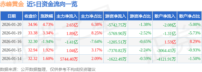 1月20日的资金流向数据方面,主力资金净流入2.65亿元,占总成交额6.38%,游资资金净流出5742.75万元,占总成交额1.38%,散户资金净流出2.08亿元,占总成交额5.0%。