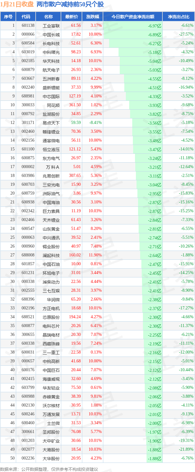 两市散户减持最多的前十只个股为: