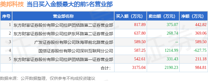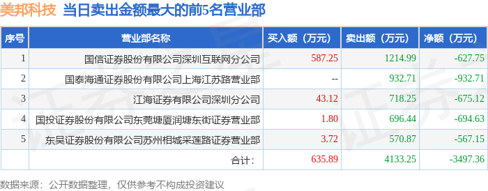 证券之星消息,沪深交易所2026年1月21日公布的交易公开信息显示,美邦科技(920471)因当日换手率达到20%的前5只股票登上龙虎榜。此次是近5个交易日内第2次上榜。