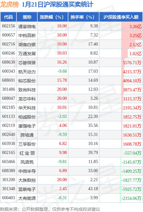 龙虎榜中有沪股通/深股通专用席位(北向资金)现身的个股共22家,其中通富微电以净买入3.26亿元排名第一。详情见下表: