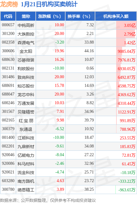 当日公布的交易所龙虎榜中有机构专用席位现身的个股共30家,其中中钨高新以净买入3.05亿元排名第一。详情见下表: