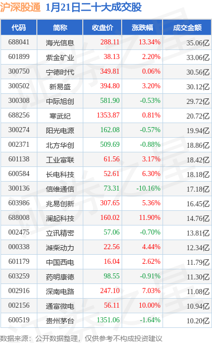 当日北向资金余额额度充足,江化微(603078)领涨,涨幅10.02%,交易所公布的沪深股通二十大成交股中成交额前三的为海光信息、紫金矿业、宁德时代,成交额分别为35.06亿元、33.06亿元、30.56亿元。详情可见下表: