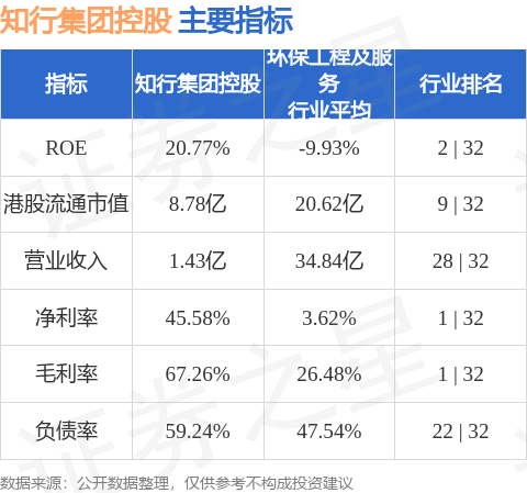 知行集团控股港股市值8.78亿港元,在环保工程及服务行业中排名第9。主要指标见下表: