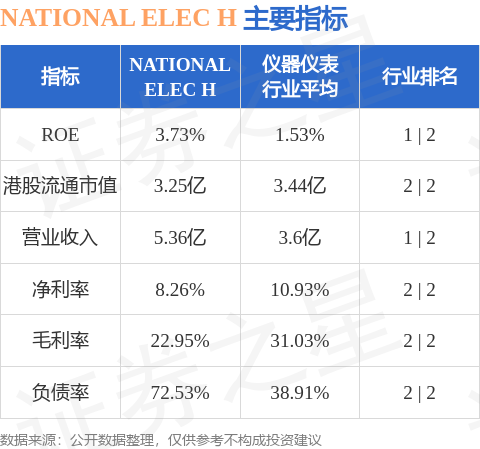NATIONAL ELEC H港股市值3.25亿港元,在仪器仪表行业中排名第2。主要指标见下表: