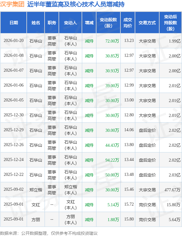 汉宇集团近半年内的董监高及核心技术人员增减持详情如下:
