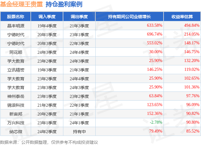 王贵重管理的嘉实科技创新混合基金在19年4季度买入晶丰明源,在持有1年又3个季度后在21年3季度卖出。持有期间的估算收益率为494.84%,持有期间晶丰明源在2019年到2021年的年报归属净利润增幅达633.58%。