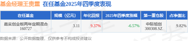 证券之星消息,截止2025年四季度末,基金经理王贵重管理的嘉实创业板两年定期混合(160727)季度净值跌6.57%。