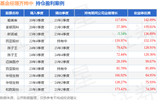 齐炜中管理的大成消费主题混合A基金在20年3季度买入爱美客,在持有2个季度后在21年1季度卖出。持有期间的估算收益率为142.09%,持有期间爱美客在2020年到2021年的年报归属净利润增幅达117.85%。