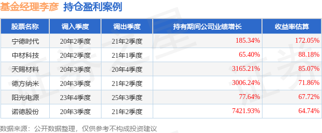 李彦管理的华夏兴和混合A基金在20年2季度买入宁德时代,在持有1年又0个季度后在21年2季度卖出。持有期间的估算收益率为172.05%,持有期间宁德时代在2020年到2021年的年报归属净利润增幅达185.34%。