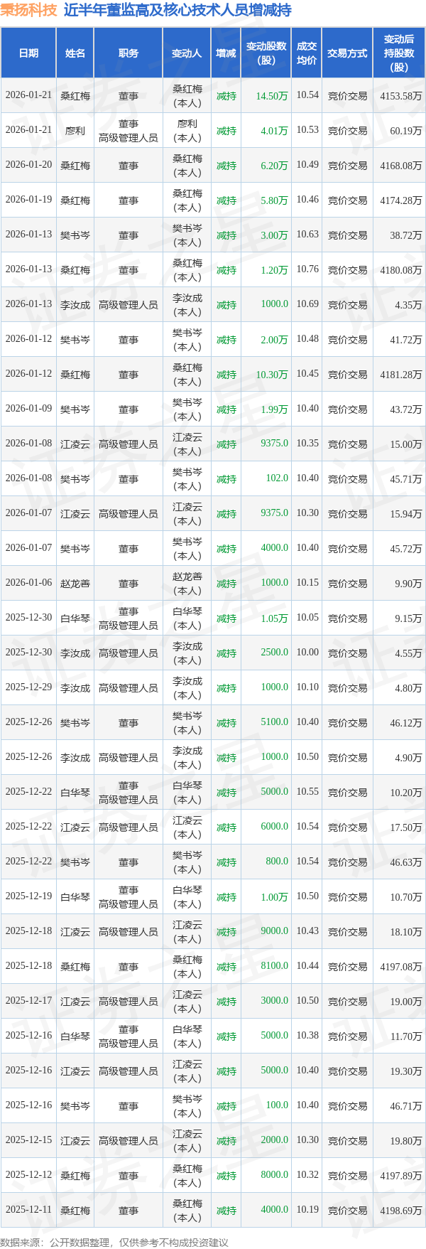 秉扬科技近半年内的董监高及核心技术人员增减持详情如下: