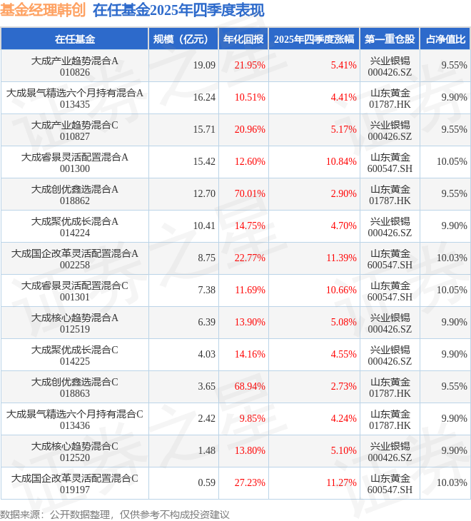 韩创管理的大成产业趋势混合A基金在22年4季度买入紫金矿业,在持有2年又0个季度后在24年4季度卖出。持有期间的估算收益率为-82.81%,持有期间紫金矿业在2022年到2024年的年报归属净利润增幅达59.92%。