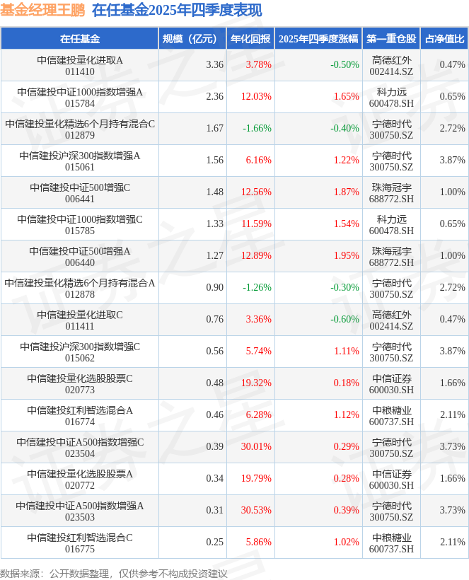 证券之星消息,截止2025年四季度末,基金经理王鹏旗下共管理16只基金,本季度表现最佳的为中信建投中证500增强A(006440),季度净值涨1.95%。
