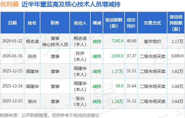 优利德近半年内的董监高及核心技术人员增减持详情如下: