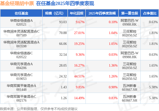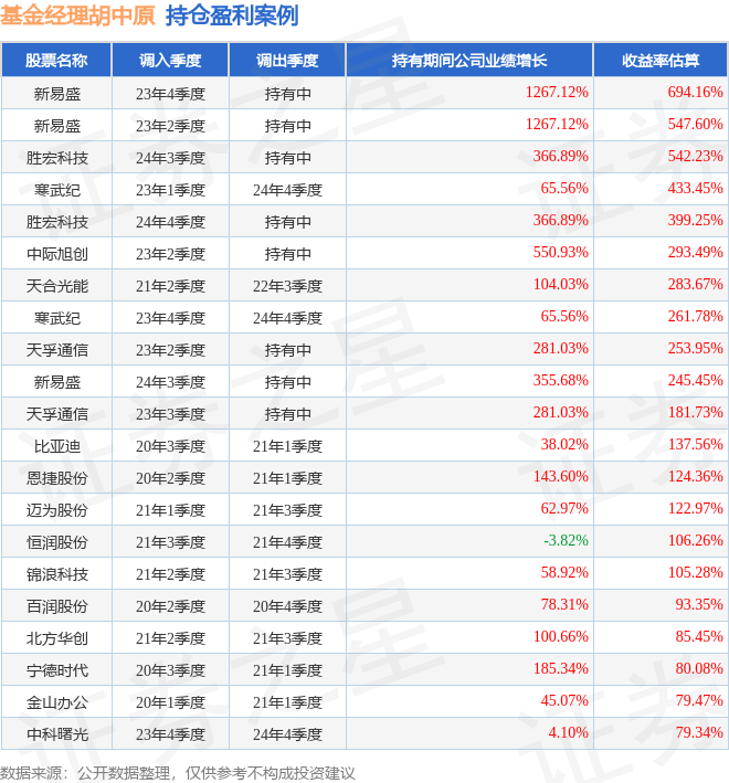 胡中原管理的华商润丰灵活配置混合A基金在23年4季度买入新易盛,已连续持有2年又0个季度。持有期间的估算收益率为694.16%,持有期间新易盛在2023年到2025年的中报归属净利润增幅达1267.12%。