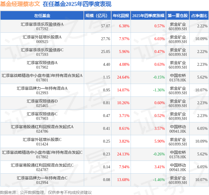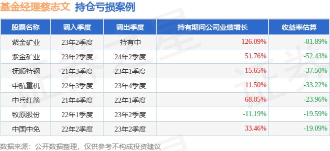 蔡志文管理的汇添富外延增长股票A基金在23年2季度买入紫金矿业,已连续持有2年又2个季度。持有期间的估算收益率为-81.89%,持有期间紫金矿业在2023年到2025年的中报归属净利润增幅达126.09%。