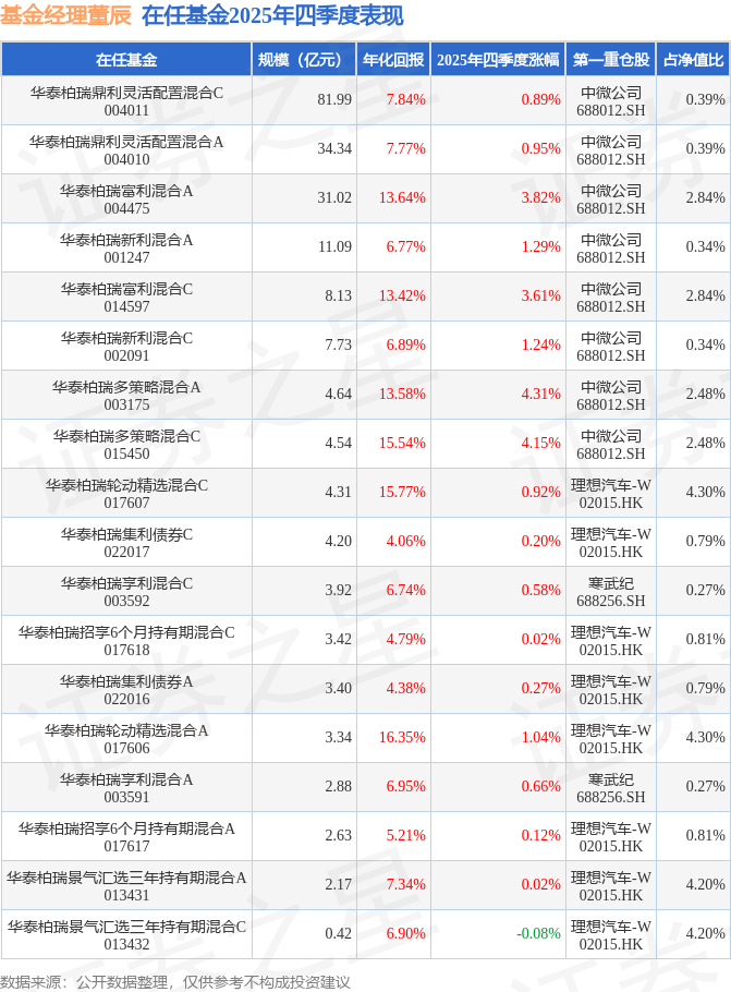 董辰在担任华泰柏瑞新利混合A(001247)基金经理的任职期间累计任职回报44.52%,平均年化收益率为7.04%。期间重仓股调仓次数共有57次,其中盈利次数为34次,胜率为59.65%;翻倍级别收益有1次,翻倍率为1.75%。