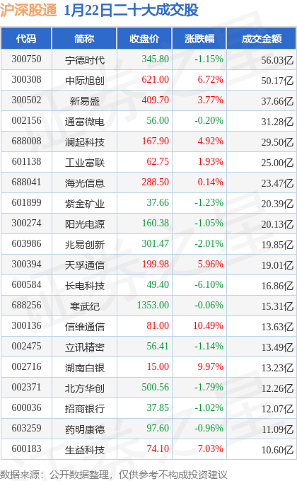 当日北向资金余额额度充足,盈方微(000670)领涨,涨幅10.05%,交易所公布的沪深股通二十大成交股中成交额前三的为宁德时代、中际旭创、新易盛,成交额分别为56.03亿元、50.17亿元、37.66亿元。详情可见下表: