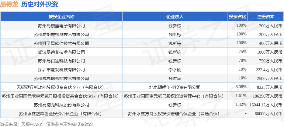 证券之星消息,根据天眼查APP显示,易德龙(603380.SH)新增一起对外投资事件,被投资公司为深圳市能观科技有限公司,法定代表人李永刚,投资占比为10%。该公司从事软件和信息技术服务业,注册资本为222.4万人民币。目前,易德龙共存在对外投资11项,详见下表:
