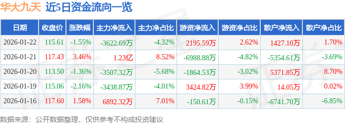 证券之星消息,截至2026年1月22日收盘,华大九天(301269)报收于115.61元,下跌1.55%,换手率1.32%,成交量7.22万手,成交额8.39亿元。